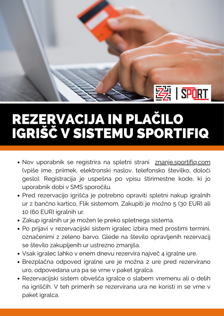 Igralci, ki želite rezervirati svoj termin, se morate prijaviti v rezervacijski sistem Sportifiq in zakupiti ustrezen paket. Prosimo za odgovorno ravnanje na igrišču ter upoštevanje pravil za uporabo le-tega.