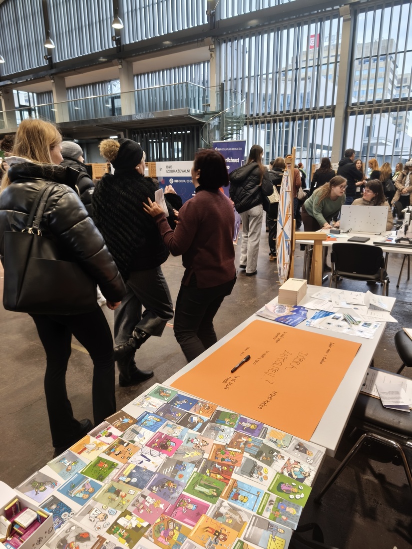 Med razstavljavci smo se predstavili tudi mi v sklopu projekta Karierni center za mlade VšečKAM in Grem+. Naša stojnica je že od jutranjih ur pritegnila številne obiskovalce z interaktivnimi in izkustvenimi aktivnostmi, ki so mlade spodbujale k razmisleku o sebi, svojih interesih in kariernih možnostih.